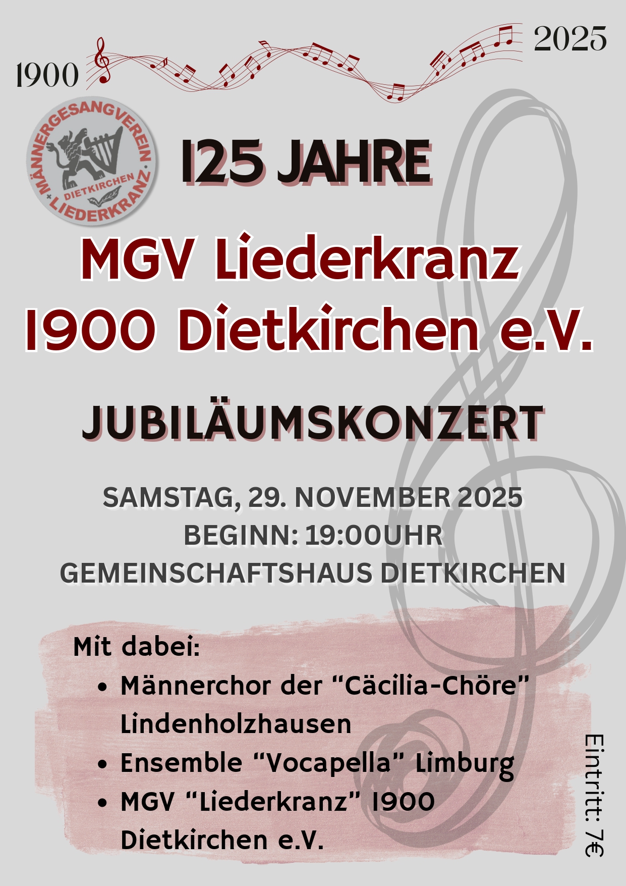 | Samstag, 29.11.2025, 19.00 Uhr | Konzert im Dorfgemeinschaftshaus in Dietkirchen | Veranstalter: MGV Liederkranz Dietkirchen Konzertplakat |