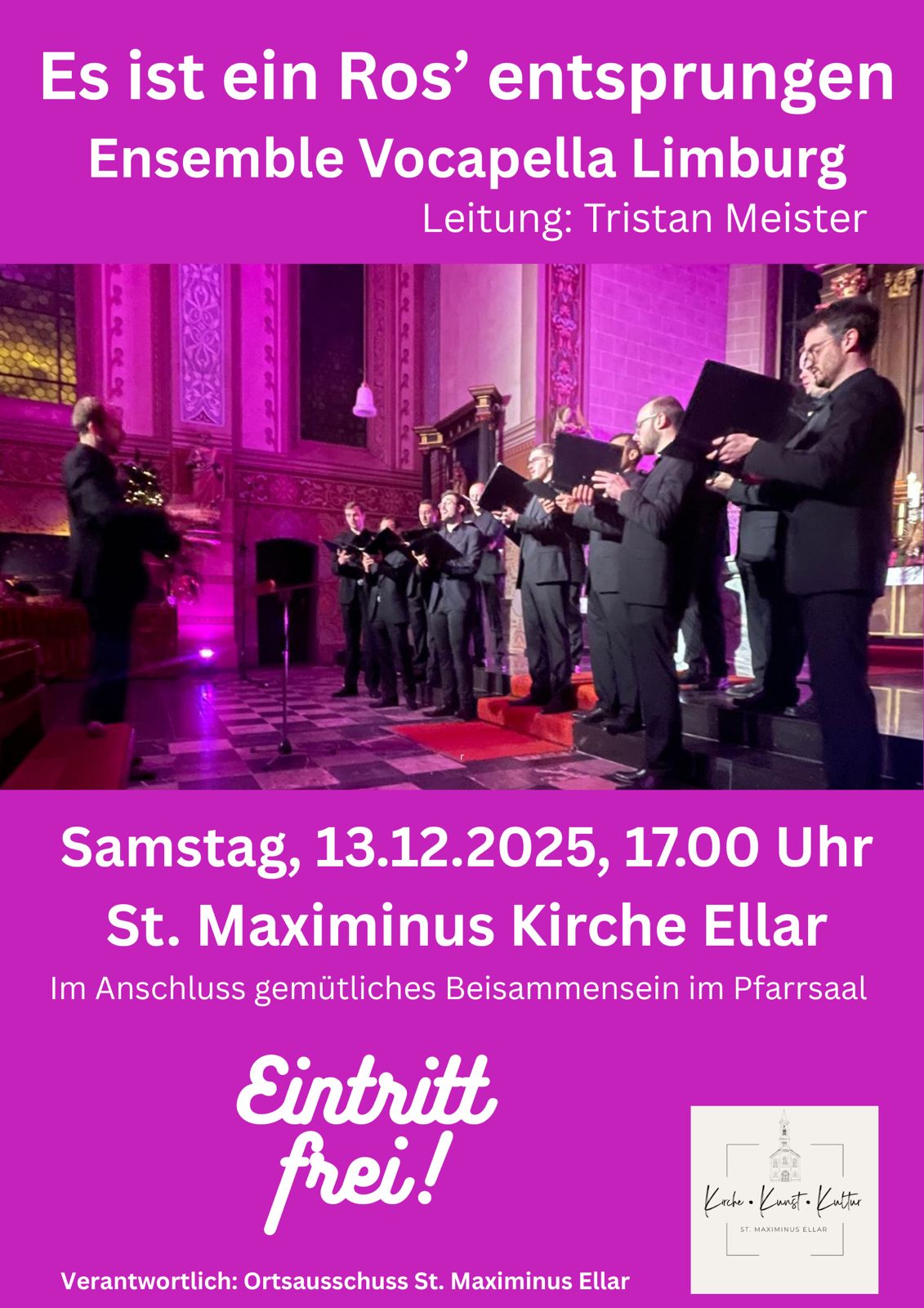 | Samstag, 13.12.2025, 17.00 Uhr | Konzert in der kath. Kirche St. Maximinus in Waldbrunn-Ellar | Veranstalter: Kirche.Kunst.Kultur Konzertplakat Eintritt frei, Spenden erbeten |