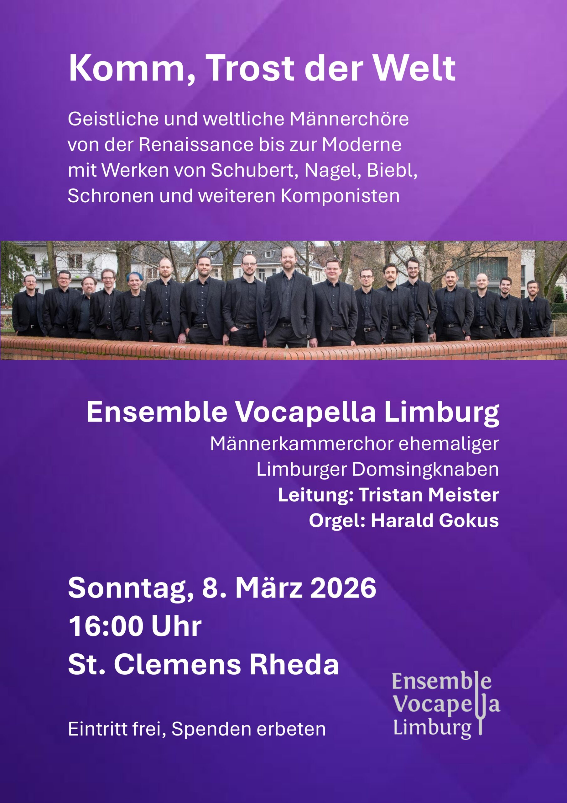 | Sonntag, 08.03.2026, 16.00 Uhr | Konzert in der kath. Kirche St. Clemens in Rheda-Wiedenbrück | Infos folgen |